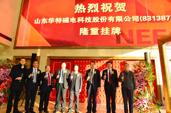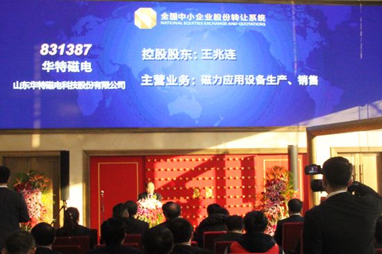 12月8日上午,山東華特磁電科技股份有限公司“新三板”掛牌儀式在全國中小企業(yè)股份轉(zhuǎn)讓有限責(zé)任公司隆重舉行。濰坊市金融工作辦公室副主任張新華、臨朐縣委常委、常務(wù)副縣長衣利民、臨朐縣金融工作辦公室主任高凌利、臨朐縣城關(guān)街道黨工委書記沈明新、臨朐縣東城街道黨工委書記孫傳坤、山東華特磁電科技股份有限公司董事長王兆連及公司股東和高管、臨朐縣相關(guān)企業(yè)負責(zé)人出席本次掛牌儀式。