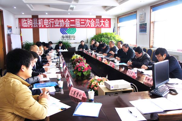 臨朐縣機電行業協會二屆三次會員大會于2015年1月24日在山東華特磁電科技股份有限公司會議室召開。臨朐縣經信局局長梅傳杰、副局長周德運、經濟運行總調度長李玉凱參加大會。大會首先由縣經信局局長梅傳杰,協會會長王兆連,德宇律師事務所所長胡志軍等為“臨朐縣機電行業協會法律服務中心”揭牌,隨后,由胡志軍律師結合相關案例講解了企業法律風險規避控制。臨朐縣榮豐源小額貸款有限公司總經理呂世平介紹貸款業務咨詢。縣機電行業協會會長王兆連分別作《縣機電協會年會工作報告》和《裝備制造業預測未來走勢分析報告》。會上,由山東恒遠利廢技術發展有限公司董事長、協會副會長馬連濤和濰坊三諾機電設備有限公司董事長王尚杰結合企業發展實際,在經濟下行條件下,遇到的新情況新問題作了交流發言。縣經信局局長梅傳杰就全縣工業發展形勢和未來新常態和新思維發展前景在會上做了重要講話。