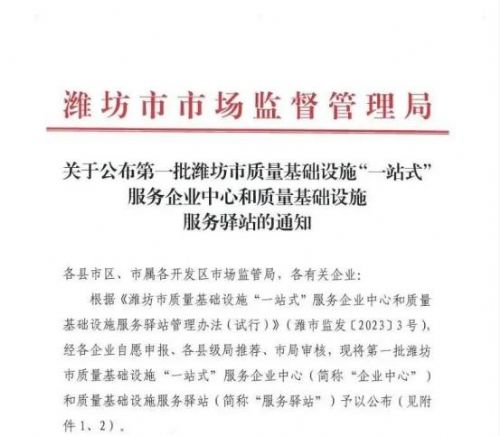 近日,濰坊市市場監管局發布了《關于公布第 一批濰坊市質量基礎設施“一站式”服務企業中心和質量基礎設施服務驛站的通知》,華特磁電成功入選“第 一批濰坊市質量基礎設施服務驛站”。