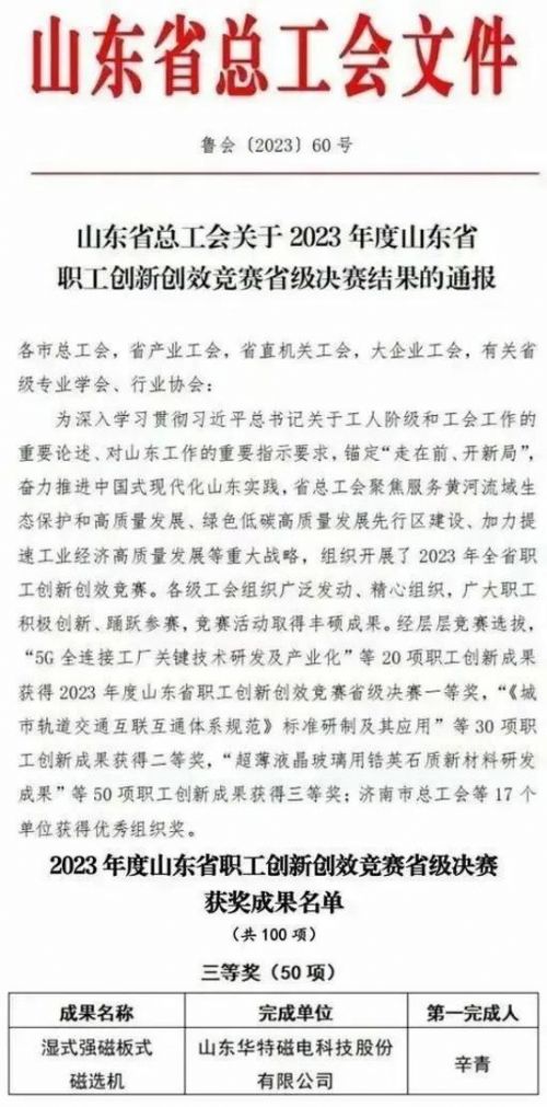 近日,在“開來杯”2023年山東省第八屆智能制造(工業(yè)4.0)創(chuàng)新創(chuàng)業(yè)大賽和全省職工創(chuàng)新創(chuàng)效競賽省級決賽中,山東華特磁電科技股份有限公司創(chuàng)新成果“*大型智能立環(huán)高梯度磁選機(jī)關(guān)*技術(shù)開發(fā)及應(yīng)用”和“濕式強(qiáng)磁板式磁選機(jī)”分別榮獲二等獎和三等獎。