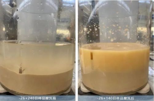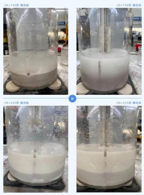 -26+325目石英砂經立環(huán)+立環(huán)+立環(huán)磁選,得到總產率為31.81%、Fe2O30.161%、SiO283.05%、Al2O314.89%的石英精礦 產品。精礦擦洗后經150目分級,其中+150目中粒度砂中總產率為24.30%、Fe2O30.012%、SiO297.36%、Al2O31.76%;-150目細粒度砂中總產率為6.79%、Fe2O30.421%、SiO254.77%、Al2O331.26%。依據硅鋁含量化驗結果分析,-150目細粒砂應為育理不完全的高嶺土。