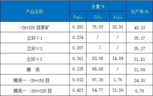 原礦經分級工藝,-26+140目石英砂擦洗后經平板+立環(huán)+立環(huán)磁選,得到總產率為52.82%、Fe2O30.037%、SiO298.40%、Al2O30.91%的石英精礦 產品。