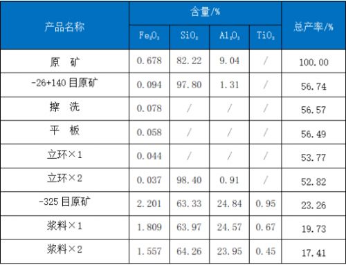原礦經分級工藝,其中-26+140目石英砂擦洗后經平板+立環(huán)1.4T+1.4T磁選,-325目高嶺土經兩遍漿料磁選,得到兩種精礦 產品。試驗流程見圖1,試驗結果見表1。