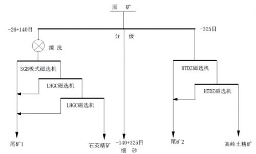 流程一:+26目石英砂破碎、磨礦、篩分至-26+150目擦洗后經立環(huán)0.6T+1.4T+1.4T磁選得到粗粒石英精礦 產品。