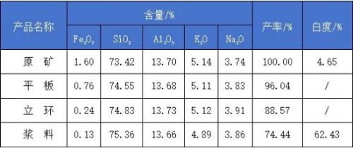 -40目原礦經平板+立環+漿料磁選,得到總產率為74.44%、Fe2O3 0.13%、SiO2 75.36%、Al2O3 13.66%、K2O 4.89%、Na2O 3.86%白度62.43%的長石精礦 產品。