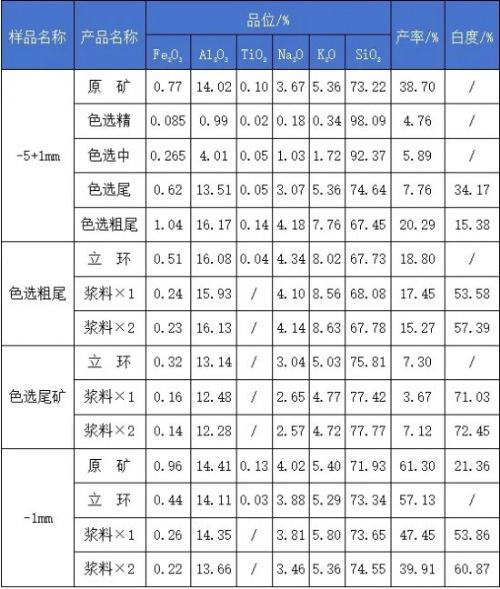 原礦破碎篩分至-50+3mm,經高溫煅燒、水淬后破碎至-5mm,-5mm產品經1mm分級,得產率為38.70%的-5+1mm產品進行一粗一精選色選試驗,得到總產率為4.76%、Fe2O3 0.085%、Al2O3 0.99%、TiO2 0.02%、Na2O 0.18%、K2O 0.34%、SiO2 98.09%的石英精礦 產品。