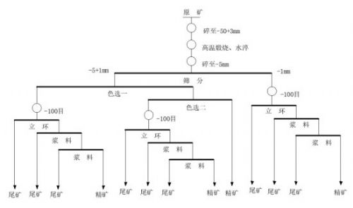 花崗巖原礦破碎篩分至-50+3mm,經高溫煅燒、水淬后破碎至-5mm,-5mm產品經1mm分級,-5+1mm產品進行一粗一精選色選試驗,色選粗尾、色選尾礦、-1mm產品分別磨至-100目細度,經立環+漿料+漿料磁選。試驗流程見圖1,試驗結果見表1。